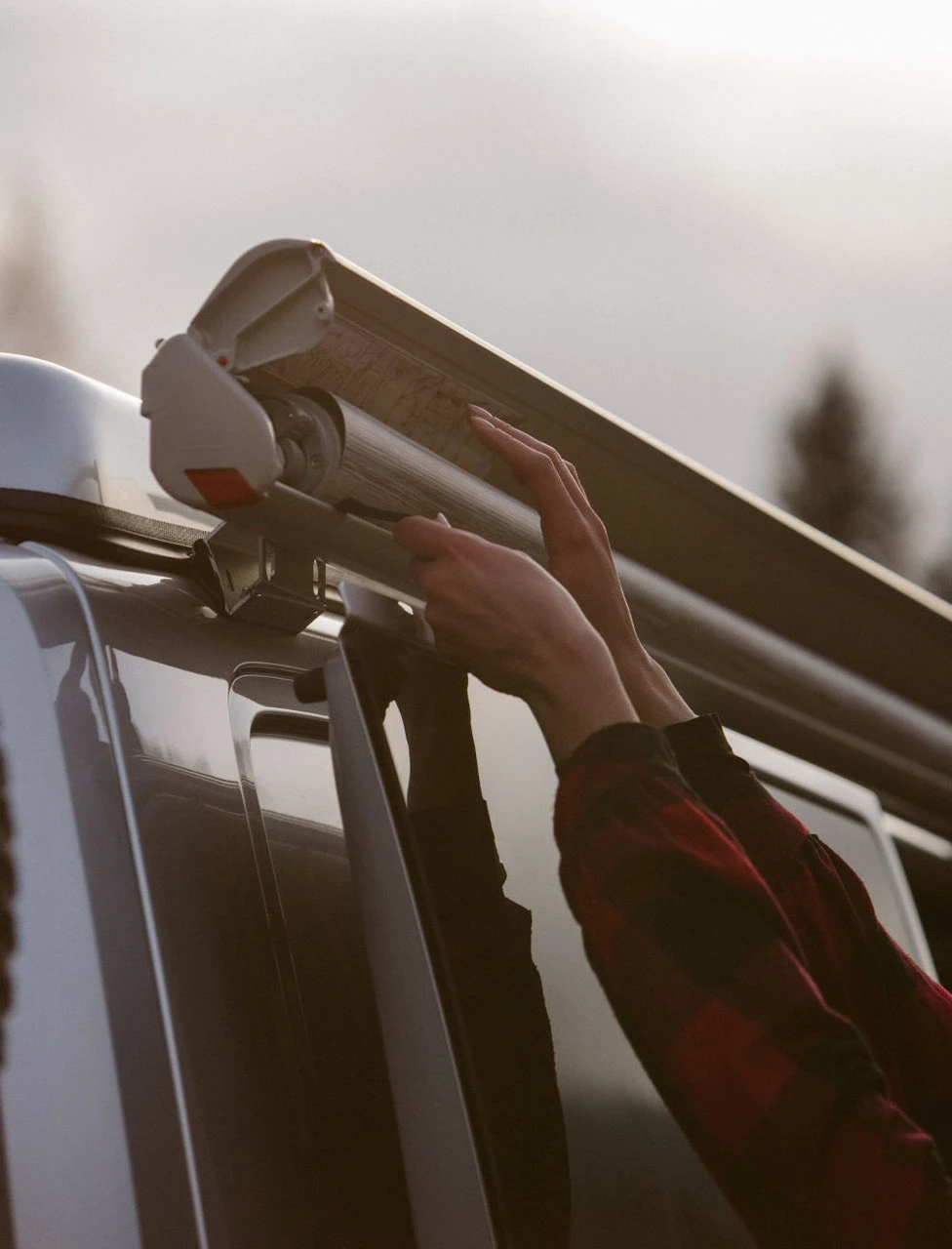 The F35 Pro Caravan and Camper Van awning keeps things simple and straight forward, helping to minimise pitching time. Using integrated telescopic legs folding out from the awning roller tube and reinforced tensioning arms, the awning fabric stays taut and sag free.