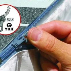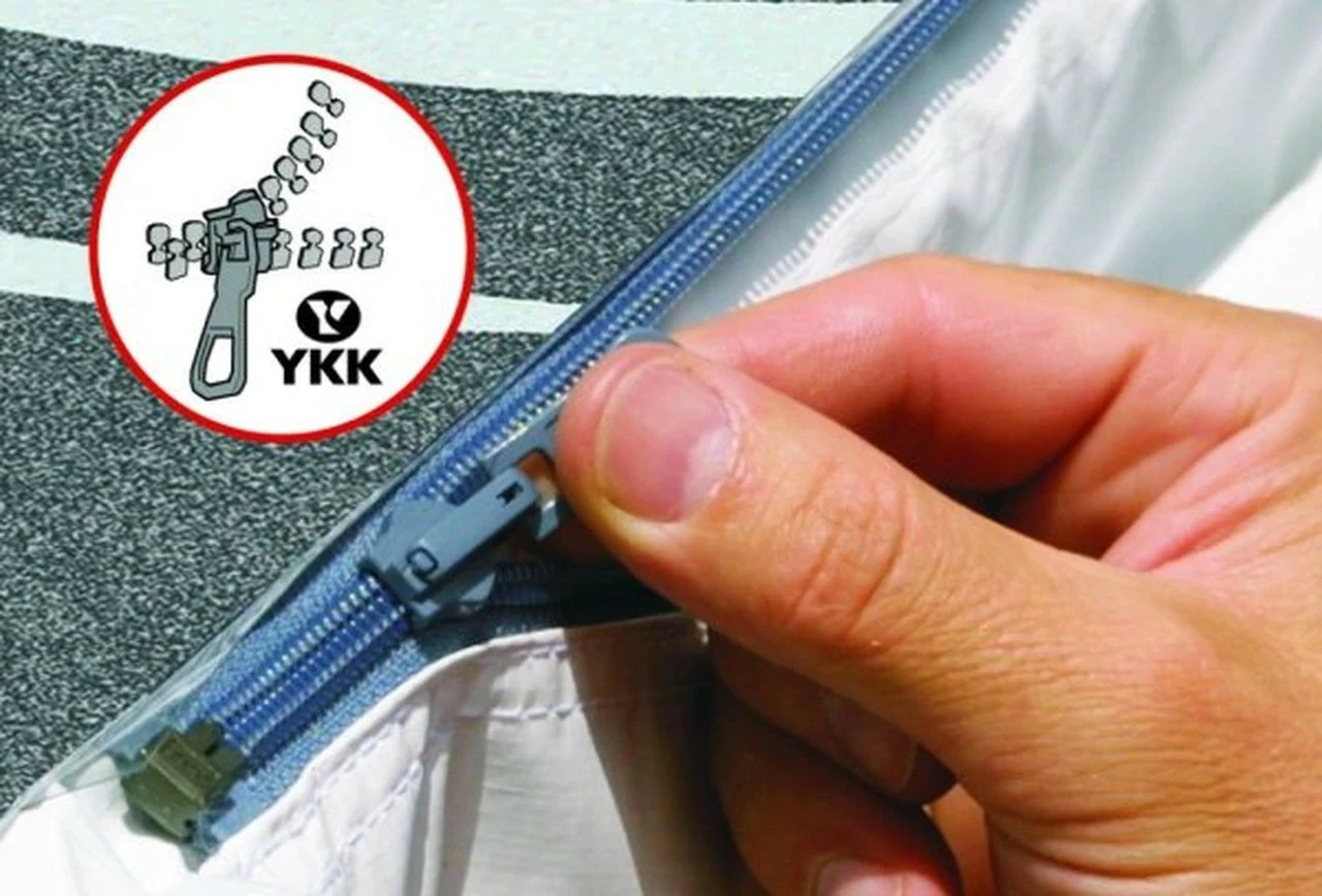 The two side panels simply zip straight to the awning canopy, Half of a YKK® zip is already stitched to the outer side edges of the canopy. The front panel slides into the front bar of the awning. Then just zip the corners together and you’re almost done! Peg down and you’re ready.
